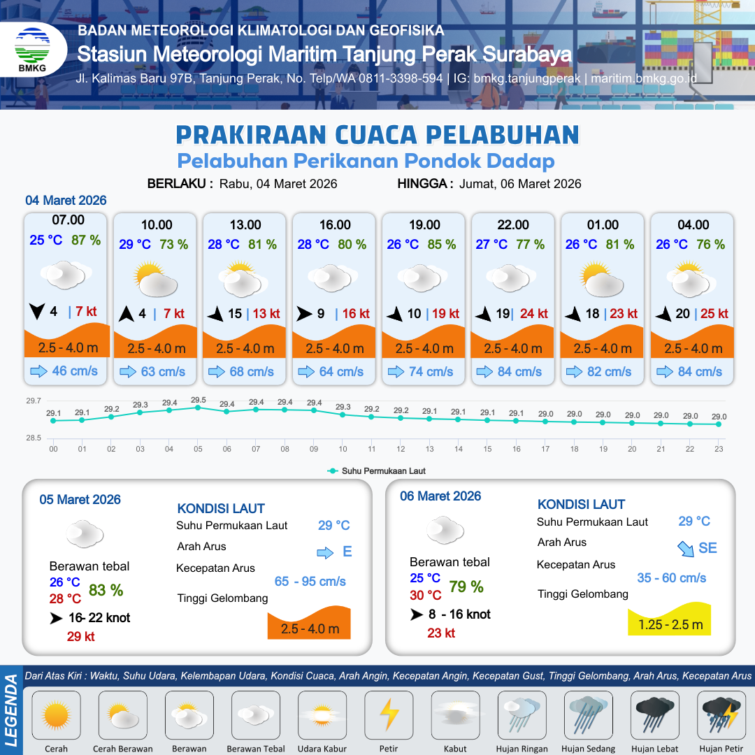 3 Mar 26, 12.00 8 jam yang lalu | Berawan Tebal | Barat 7 kt Gust Peningkatan kecepatan angin yang singkat dan tiba-tiba : 15 kt | | | 10 km | 25 °C | 90 % | +0.67 m |
