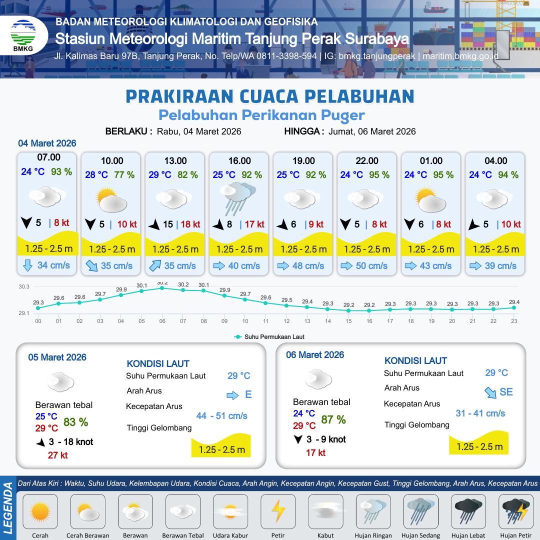 3 Mar 26, 05.00 15 jam yang lalu | Berawan Tebal | Barat 4 kt Gust Peningkatan kecepatan angin yang singkat dan tiba-tiba : 5 kt | | | 10 km | 29 °C | 72 % | +0.34 m |