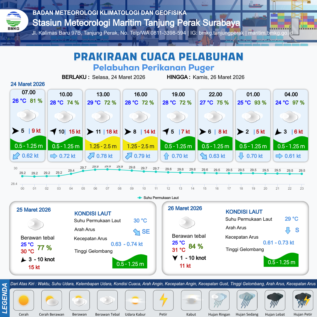 24 Mar 26, 03.00 3 jam kedepan | Barat Daya 10 kt Gust Peningkatan kecepatan angin yang singkat dan tiba-tiba : 15 kt | 1.2 m Rendah | Timur 0.7 Knot | 10 km | 28 °C | 74 % | +0.90 m | |