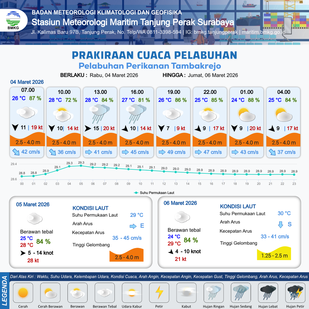 3 Mar 26, 04.00 16 jam yang lalu | Berawan Tebal | Utara 8 kt Gust Peningkatan kecepatan angin yang singkat dan tiba-tiba : 10 kt | | | 10 km | 29 °C | 75 % | +0.45 m |