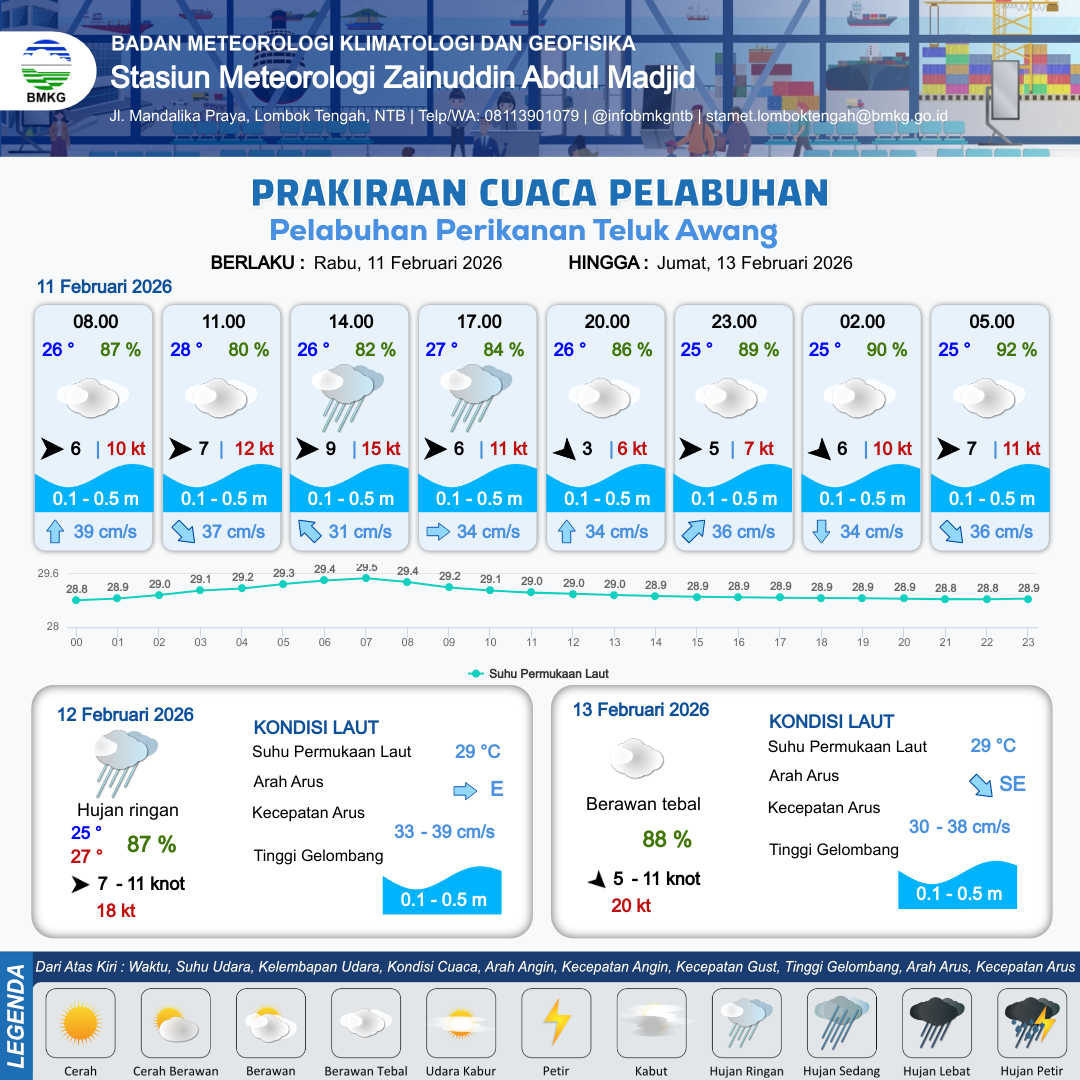 11 Feb 26, 19.00 3 jam kedepan | Barat Laut 6 kt Gust Peningkatan kecepatan angin yang singkat dan tiba-tiba : 10 kt | 0.1 m Tenang | Selatan 34.0 cm/s | 8 km | 25 °C | 91 % | -0.07 m | |