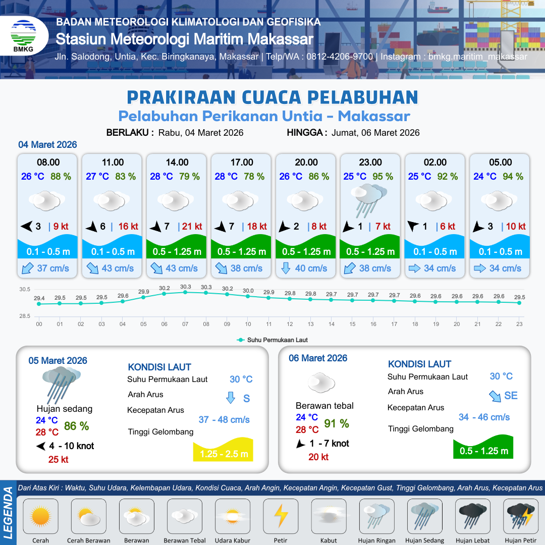 3 Mar 26, 05.00 15 jam yang lalu | Hujan Ringan | Barat 9 kt Gust Peningkatan kecepatan angin yang singkat dan tiba-tiba : 26 kt | | | 8 km | 29 °C | 81 % | +0.23 m |