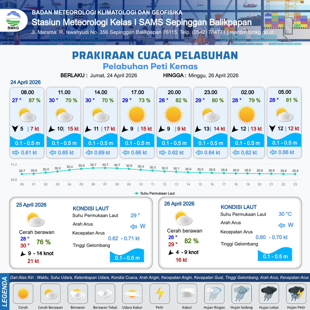 24 Apr 26, 14.00 6 jam kedepan | Timur Laut 13 kt Gust Peningkatan kecepatan angin yang singkat dan tiba-tiba : 12 kt | 0.1 m Tenang | Barat 0.6 Knot | 10 km | 29 °C | 80 % | -0.22 m | |