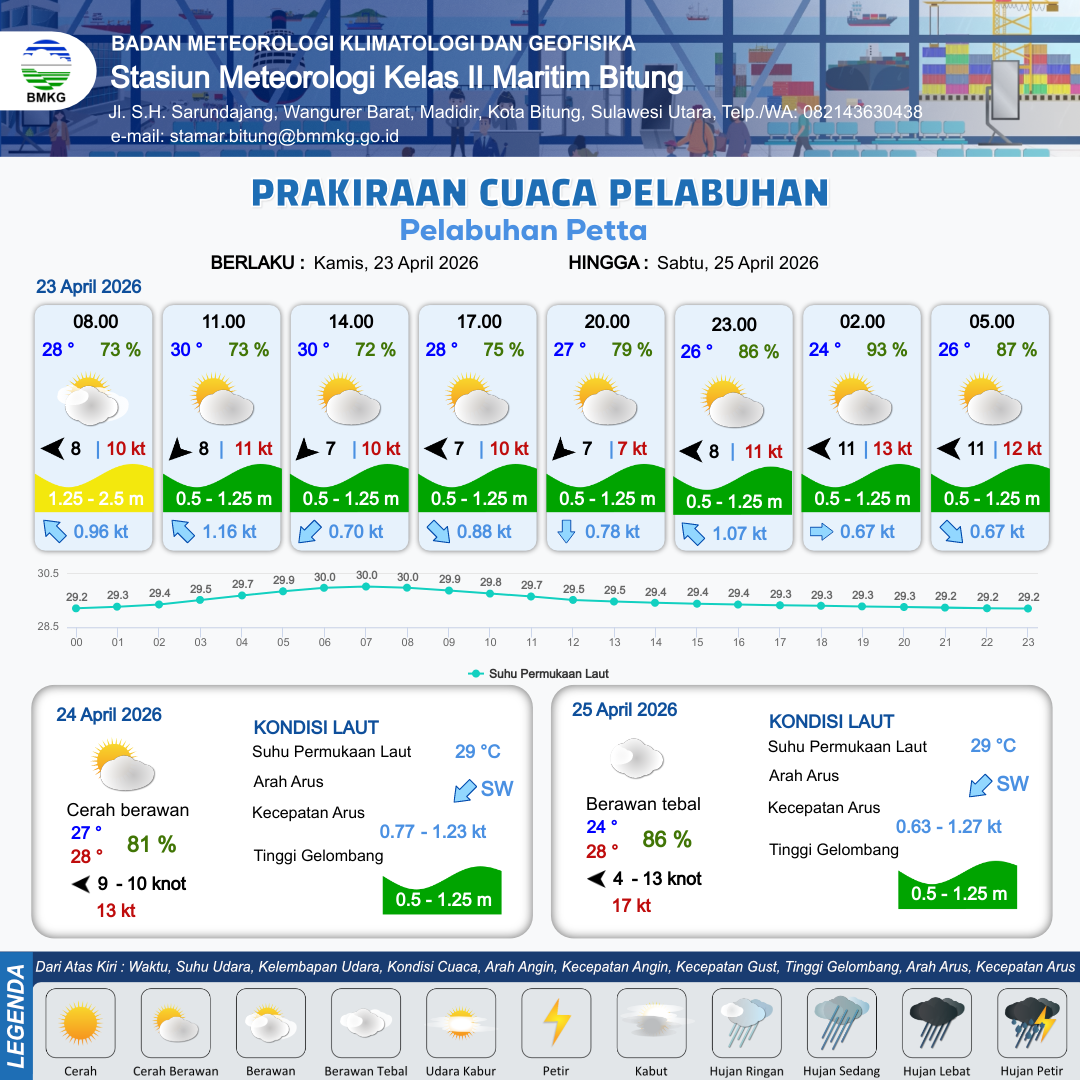 23 Apr 26, 15.00 1 hari 4 jam kedepan | Timur 8 kt Gust Peningkatan kecepatan angin yang singkat dan tiba-tiba : 11 kt | 1 m Rendah | Barat Laut 1.1 Knot | 9 km | 26 °C | 86 % | -0.07 m | |