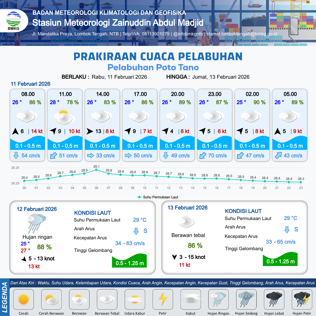 11 Feb 26, 23.00 7 jam kedepan | Barat Daya 5 kt Gust Peningkatan kecepatan angin yang singkat dan tiba-tiba : 12 kt | 0.3 m Tenang | Tenggara 40.0 cm/s | 8 km | 25 °C | 89 % | -0.13 m |