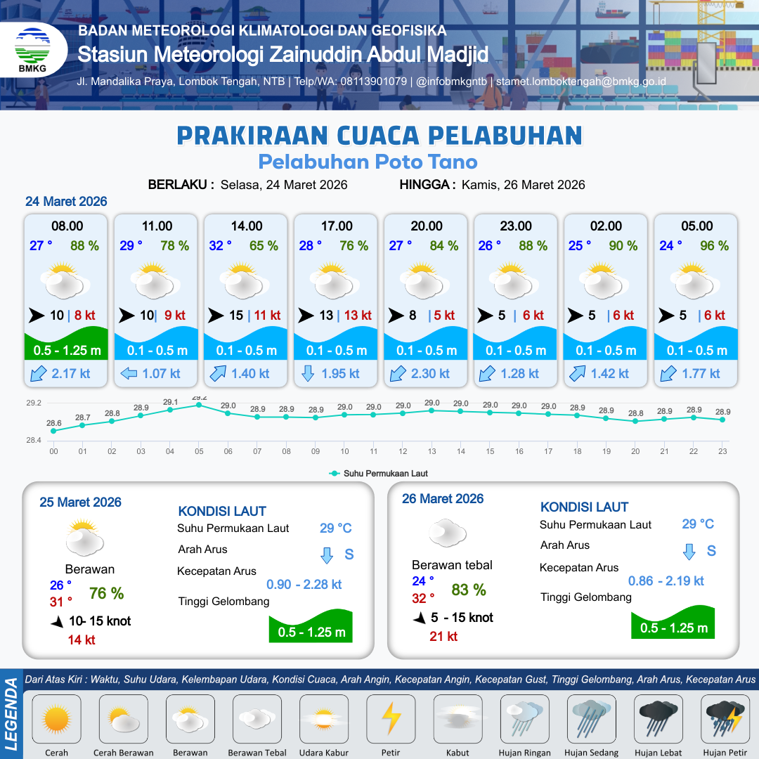 24 Mar 26, 02.00 2 jam kedepan | Barat 10 kt Gust Peningkatan kecepatan angin yang singkat dan tiba-tiba : 8 kt | 0.5 m Rendah | Barat 1.6 Knot | 7 km | 28 °C | 80 % | -0.26 m | |