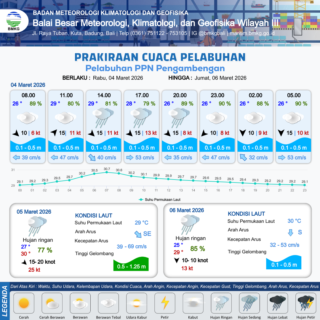 3 Mar 26, 03.00 17 jam yang lalu | Berawan Tebal | Barat 7 kt Gust Peningkatan kecepatan angin yang singkat dan tiba-tiba : 13 kt | | | 10 km | 29 °C | 80 % | +0.97 m |
