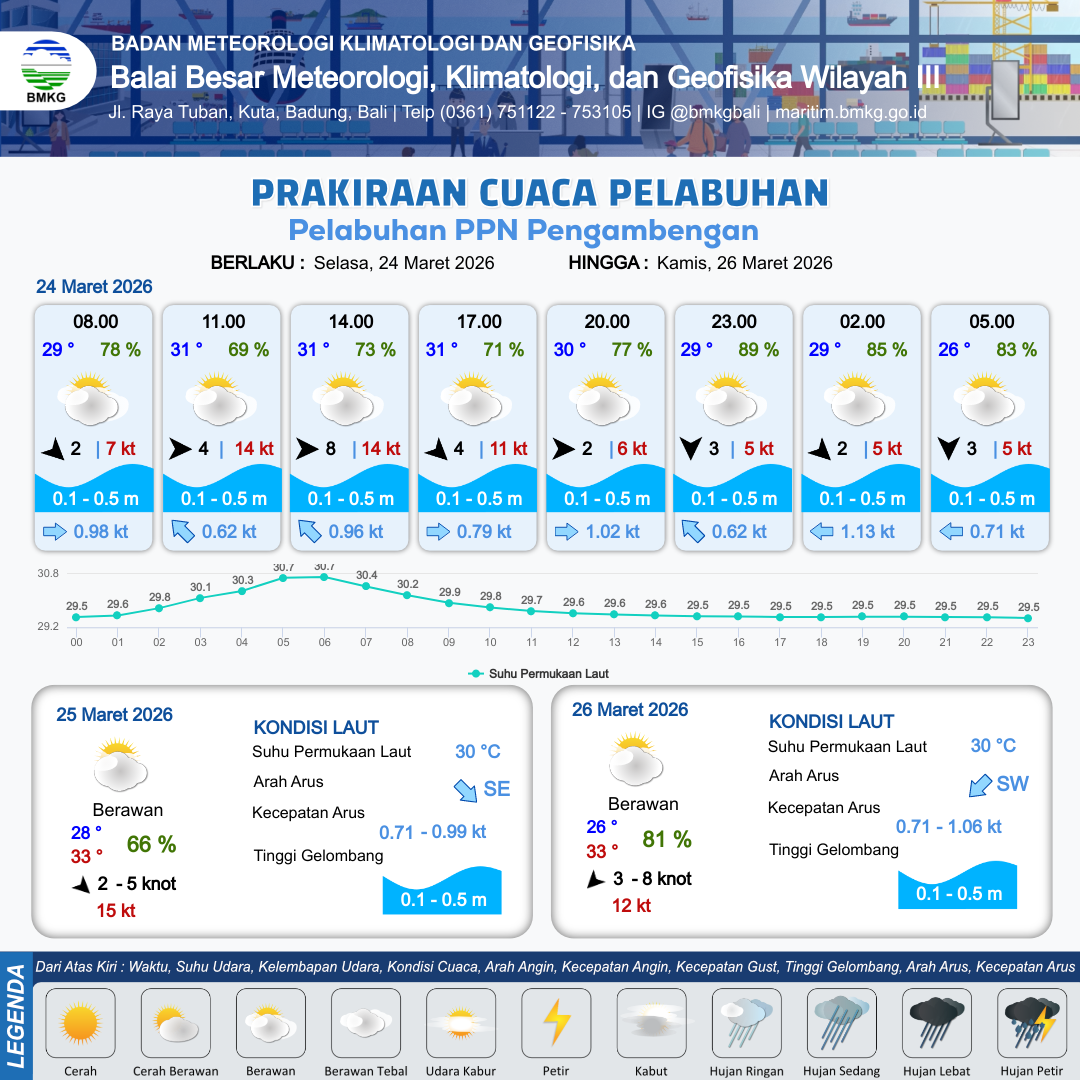 24 Mar 26, 12.00 12 jam kedepan | Barat 2 kt Gust Peningkatan kecepatan angin yang singkat dan tiba-tiba : 6 kt | 0.5 m Rendah | Timur 1.0 Knot | 10 km | 30 °C | 77 % | -1.19 m | |
