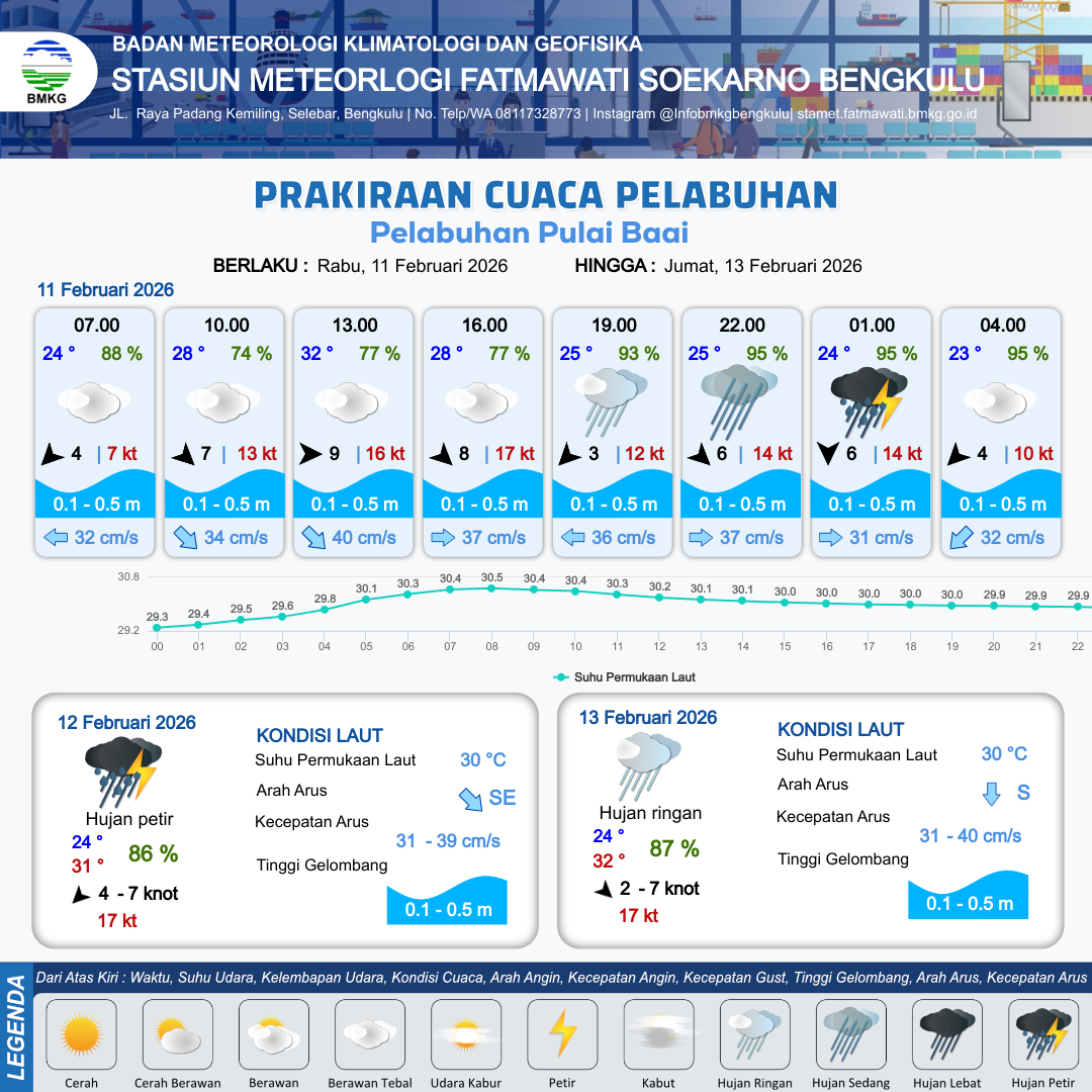 11 Feb 26, 23.00 7 jam kedepan | Timur Laut 6 kt Gust Peningkatan kecepatan angin yang singkat dan tiba-tiba : 12 kt | 0.3 m Tenang | Selatan 32.0 cm/s | 10 km | 24 °C | 93 % | -0.36 m |