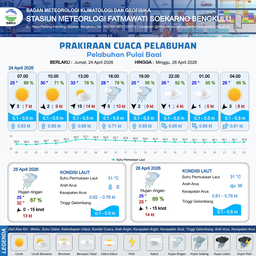 13 Apr 26, 10.00 10 hari 23 jam yang lalu | Barat Daya 8 kt Gust Peningkatan kecepatan angin yang singkat dan tiba-tiba : 8 kt | 0.6 m Rendah | Tenggara 0.9 Knot | 10 km | 29 °C | 77 % | +0.49 m | |