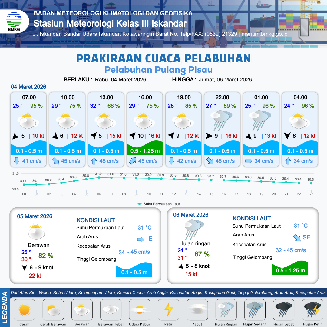 3 Mar 26, 08.00 12 jam yang lalu | Berawan | Barat Daya 12 kt Gust Peningkatan kecepatan angin yang singkat dan tiba-tiba : 17 kt | | | 9 km | 31 °C | 70 % | +1.15 m |