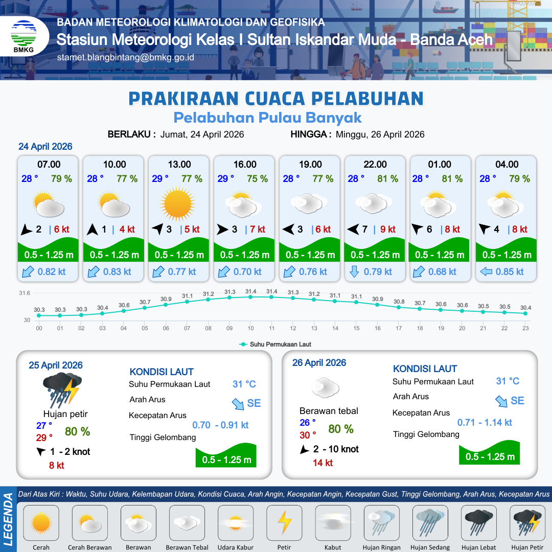 24 Apr 26, 13.00 5 jam kedepan | Timur 3 kt Gust Peningkatan kecepatan angin yang singkat dan tiba-tiba : 5 kt | 0.8 m Rendah | Selatan 0.8 Knot | 10 km | 28 °C | 80 % | -0.23 m | |