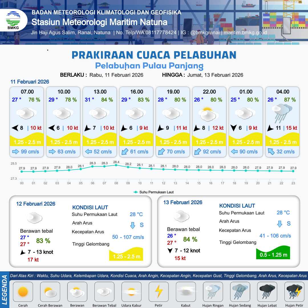 11 Feb 26, 19.00 3 jam kedepan | Utara 6 kt Gust Peningkatan kecepatan angin yang singkat dan tiba-tiba : 10 kt | 1.4 m Sedang | Barat 77.0 cm/s | 6 km | 26 °C | 82 % | -0.05 m | |