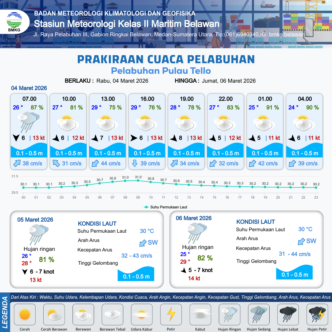 3 Mar 26, 04.00 16 jam yang lalu | Cerah Berawan | Utara 3 kt Gust Peningkatan kecepatan angin yang singkat dan tiba-tiba : 7 kt | | | 10 km | 27 °C | 80 % | -0.33 m |