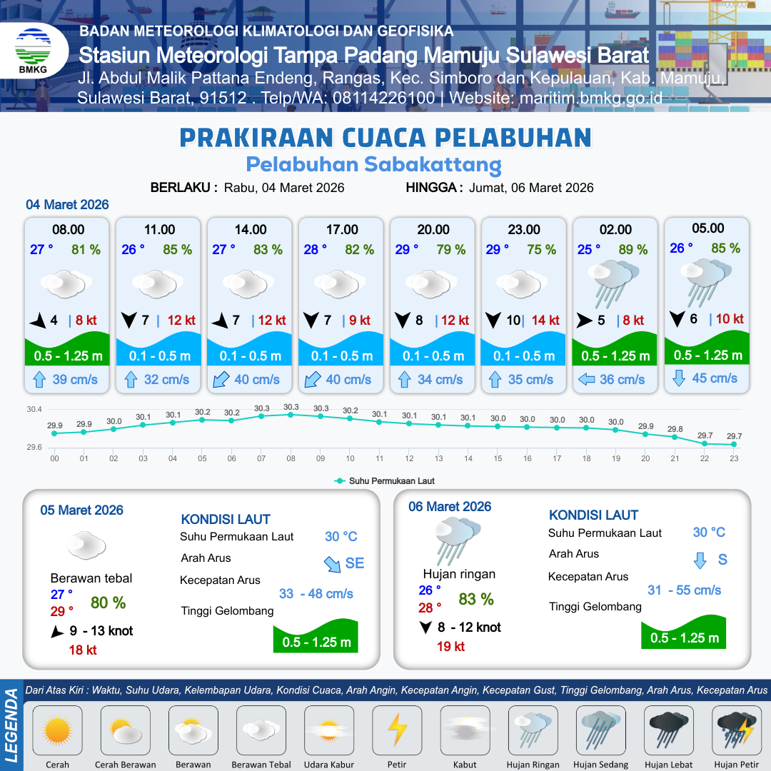 3 Mar 26, 23.00 3 jam kedepan | Berawan Tebal | Utara 9 kt Gust Peningkatan kecepatan angin yang singkat dan tiba-tiba : 13 kt | | | 10 km | 27 °C | 84 % | +0.30 m |