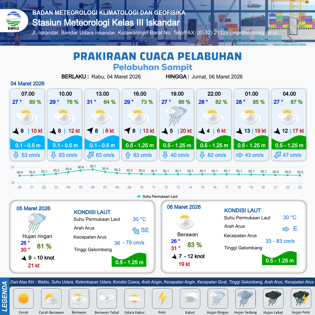 3 Mar 26, 04.00 16 jam yang lalu | Berawan | Barat 5 kt Gust Peningkatan kecepatan angin yang singkat dan tiba-tiba : 7 kt | | | 9 km | 30 °C | 65 % | -1.61 m |