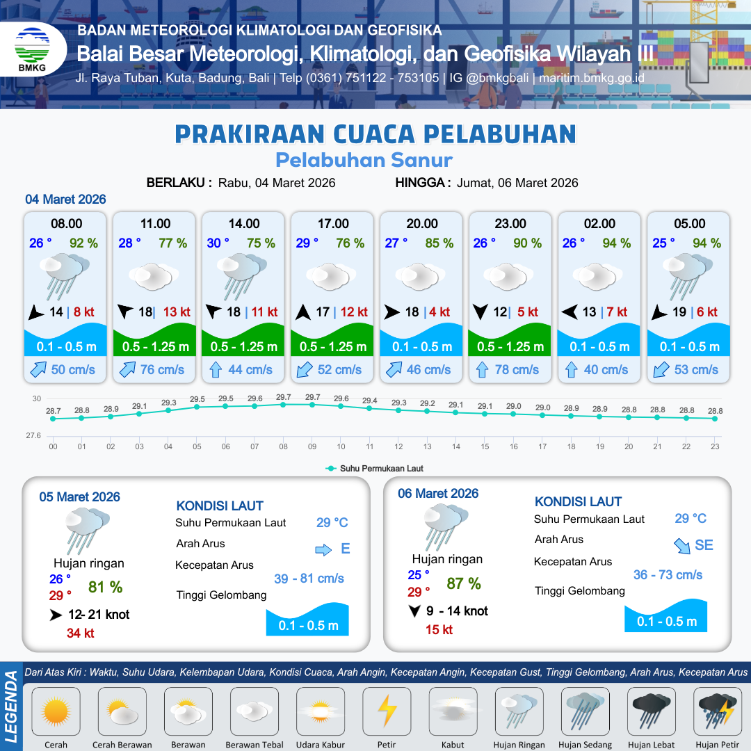 3 Mar 26, 14.00 6 jam yang lalu | Berawan Tebal | Barat 8 kt Gust Peningkatan kecepatan angin yang singkat dan tiba-tiba : 8 kt | | | 10 km | 27 °C | 90 % | +1.31 m |