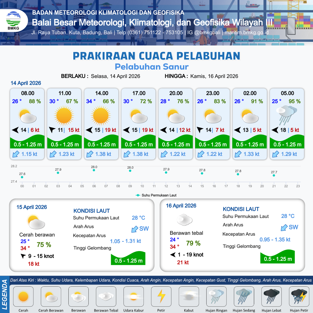 14 Apr 26, 13.00 8 jam kedepan | Timur 14 kt Gust Peningkatan kecepatan angin yang singkat dan tiba-tiba : 9 kt | 0.7 m Rendah | Barat Daya 1.2 Knot | 10 km | 27 °C | 77 % | +0.40 m | |