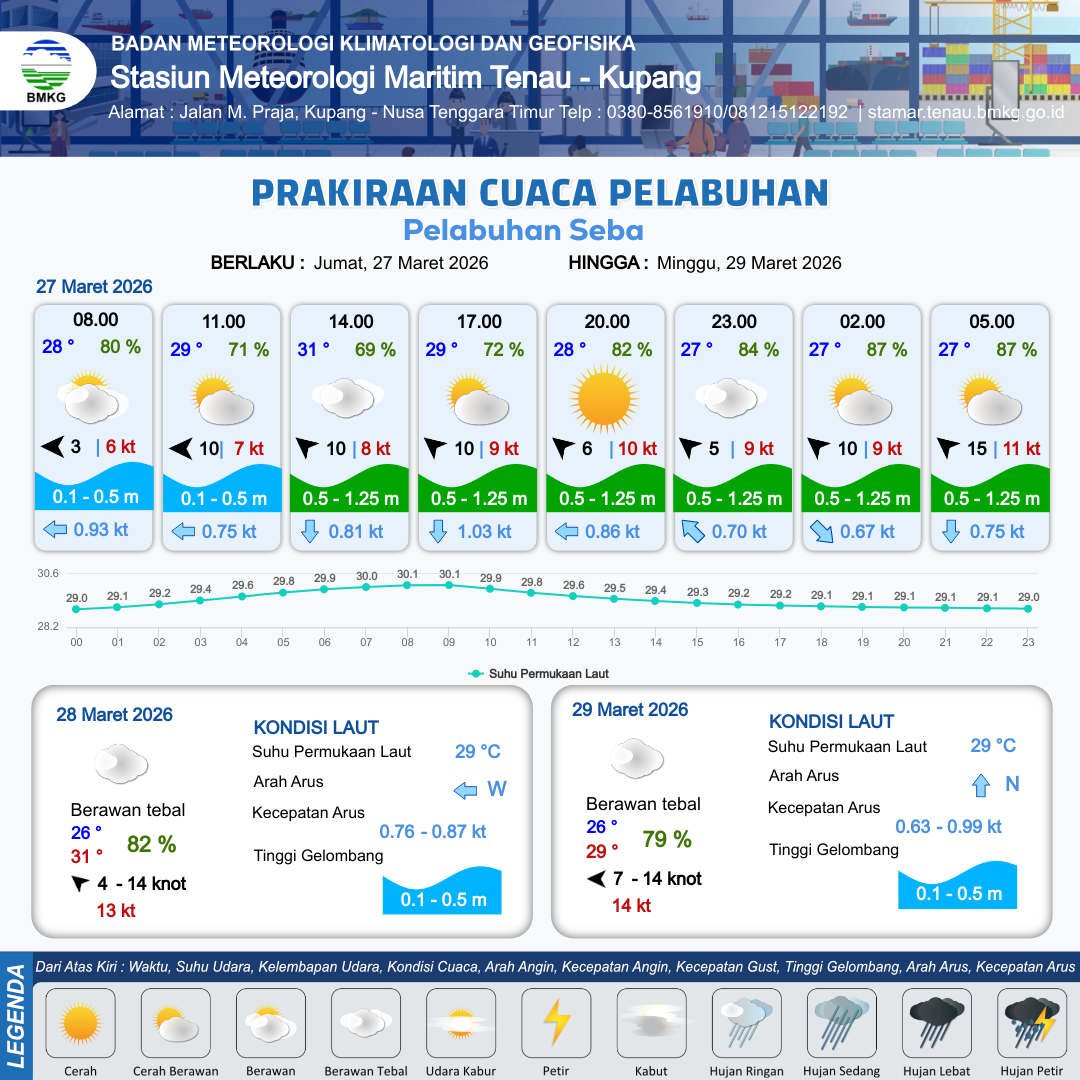 27 Mar 26, 20.00 12 jam kedepan | Tenggara 15 kt Gust Peningkatan kecepatan angin yang singkat dan tiba-tiba : 9 kt | 0.7 m Rendah | Tenggara 0.8 Knot | 8 km | 27 °C | 85 % | -0.18 m | |