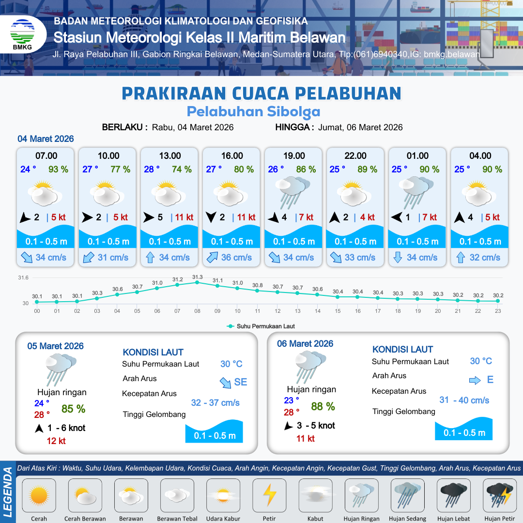 3 Mar 26, 10.00 10 jam yang lalu | Hujan Ringan | Barat 2 kt Gust Peningkatan kecepatan angin yang singkat dan tiba-tiba : 8 kt | | | 10 km | 25 °C | 89 % | +0.37 m |