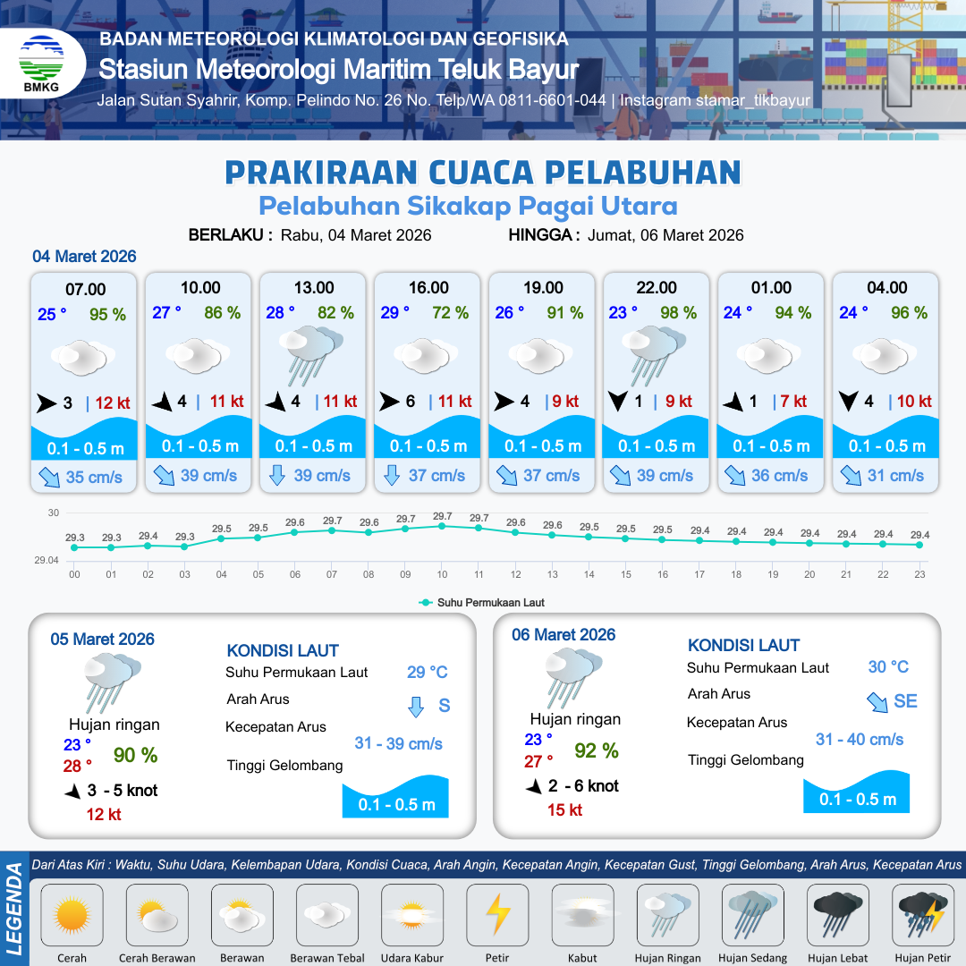 3 Mar 26, 07.00 13 jam yang lalu | Berawan | Barat Laut 5 kt Gust Peningkatan kecepatan angin yang singkat dan tiba-tiba : 12 kt | | | 10 km | 29 °C | 72 % | -0.24 m |