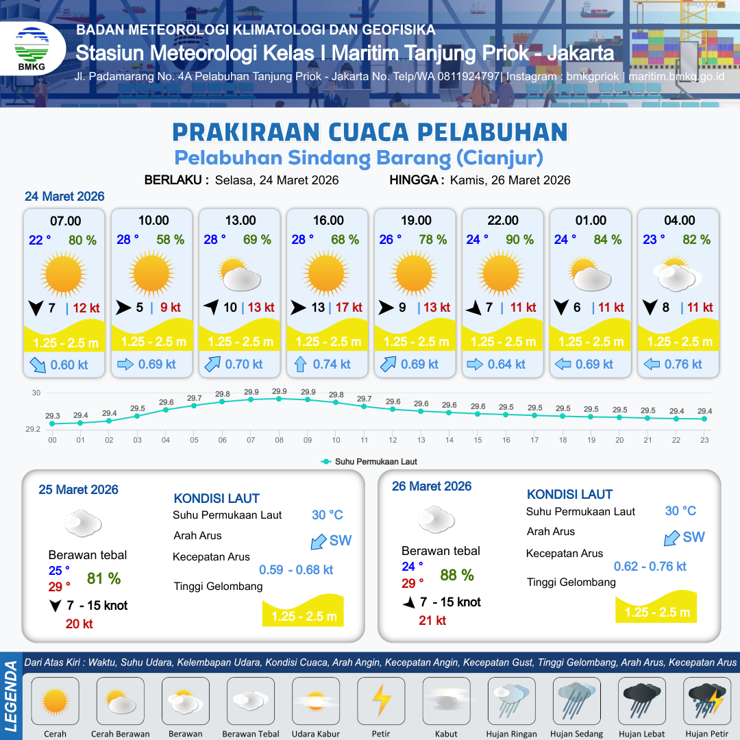 24 Mar 26, 22.00 22 jam kedepan | Utara 8 kt Gust Peningkatan kecepatan angin yang singkat dan tiba-tiba : 12 kt | 1.5 m Sedang | Barat 0.7 Knot | 8 km | 24 °C | 81 % | -0.50 m | |