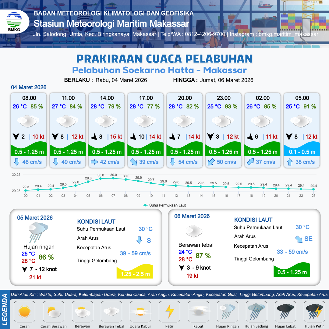 3 Mar 26, 05.00 15 jam yang lalu | Hujan Ringan | Barat 11 kt Gust Peningkatan kecepatan angin yang singkat dan tiba-tiba : 20 kt | | | 8 km | 29 °C | 80 % | +0.28 m |
