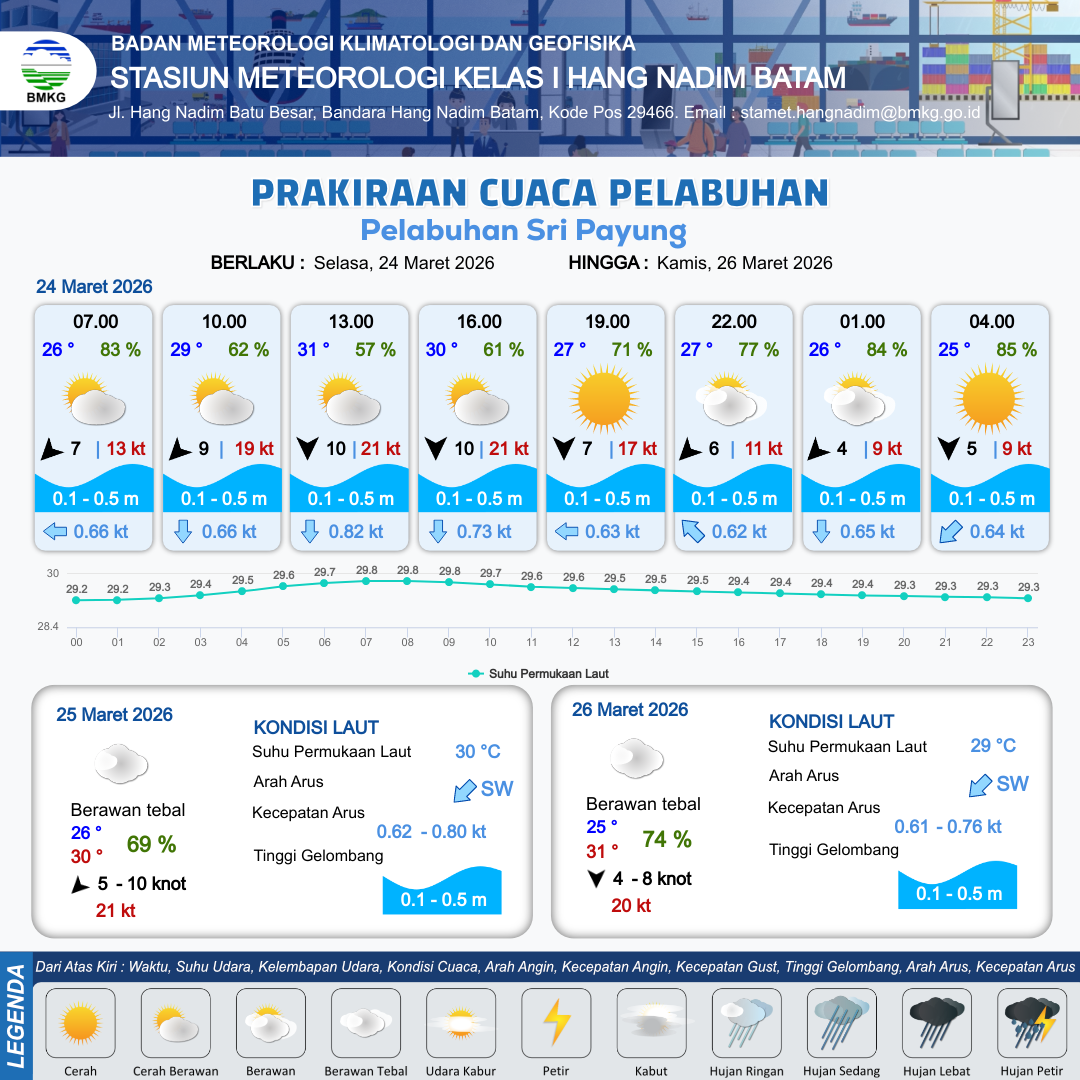 24 Mar 26, 03.00 3 jam kedepan | Timur Laut 9 kt Gust Peningkatan kecepatan angin yang singkat dan tiba-tiba : 19 kt | 0.1 m Tenang | Selatan 0.7 Knot | 10 km | 29 °C | 62 % | -0.57 m | |