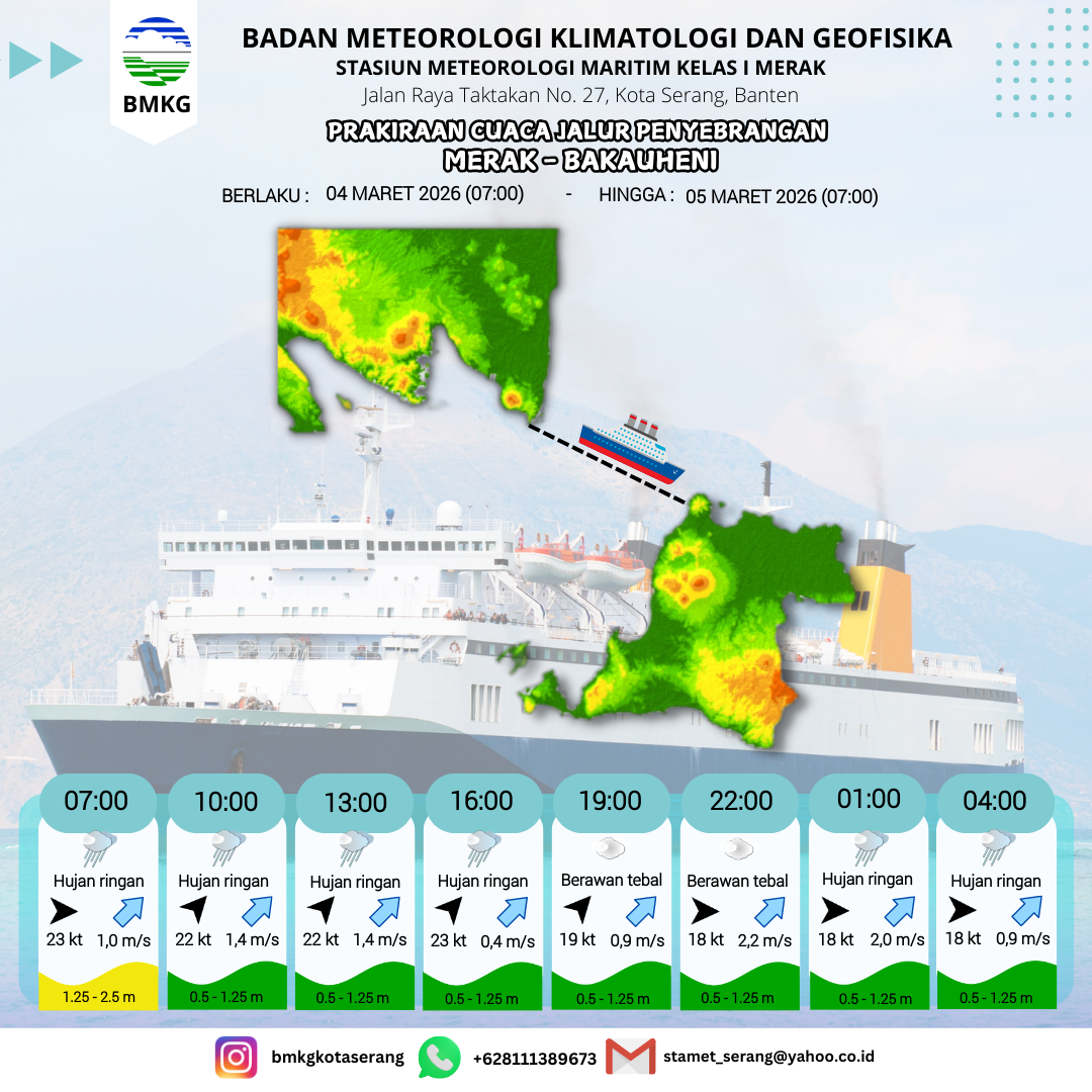 3 Mar 26, 23.00 3 jam kedepan | Berawan Tebal | Barat 14 kt Gust Peningkatan kecepatan angin yang singkat dan tiba-tiba : 23 kt | | | 10 km | 25 °C | 85 % | +0.22 m |