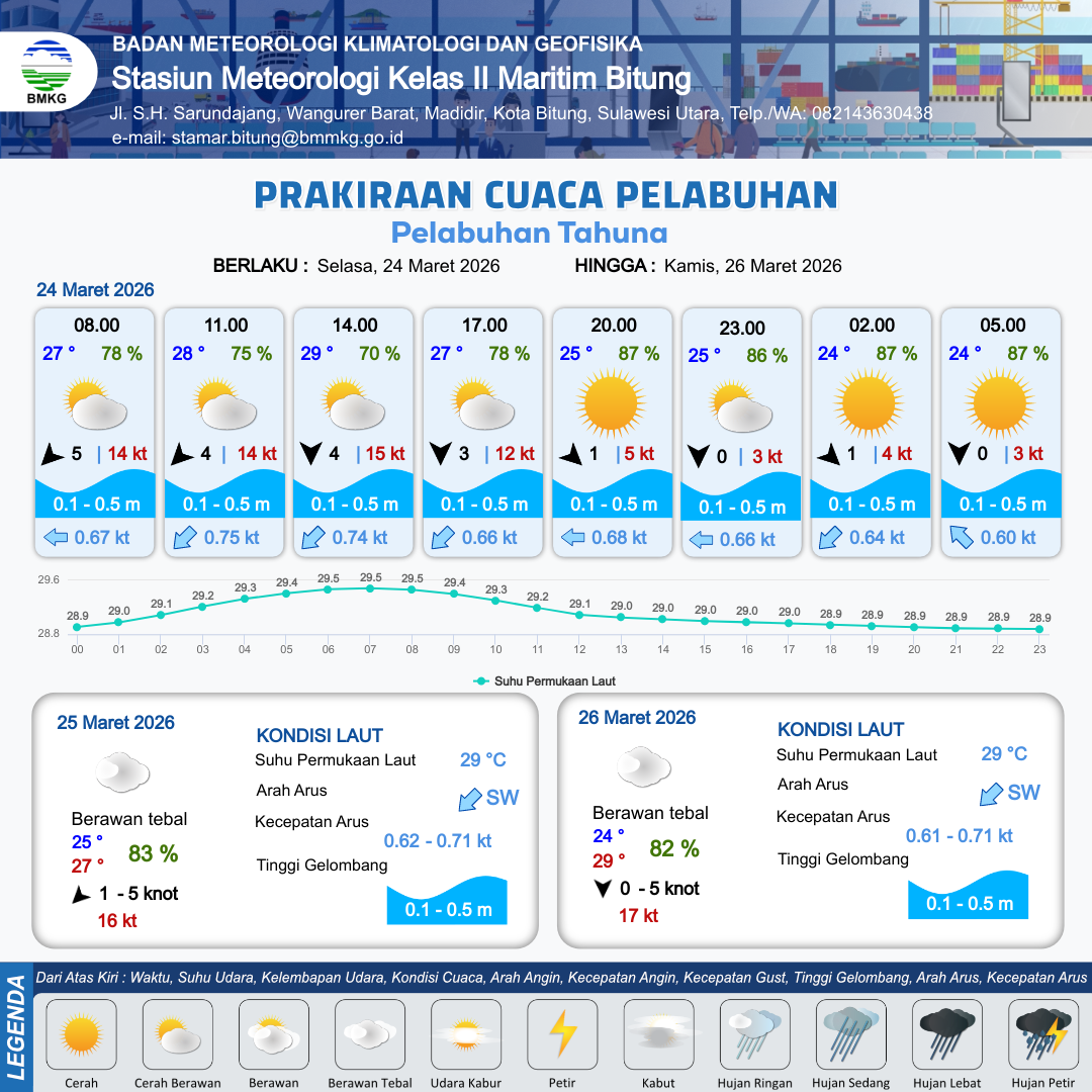 24 Mar 26, 06.00 6 jam kedepan | Utara 4 kt Gust Peningkatan kecepatan angin yang singkat dan tiba-tiba : 15 kt | 0.1 m Tenang | Barat Daya 0.7 Knot | 10 km | 29 °C | 70 % | -0.52 m | |