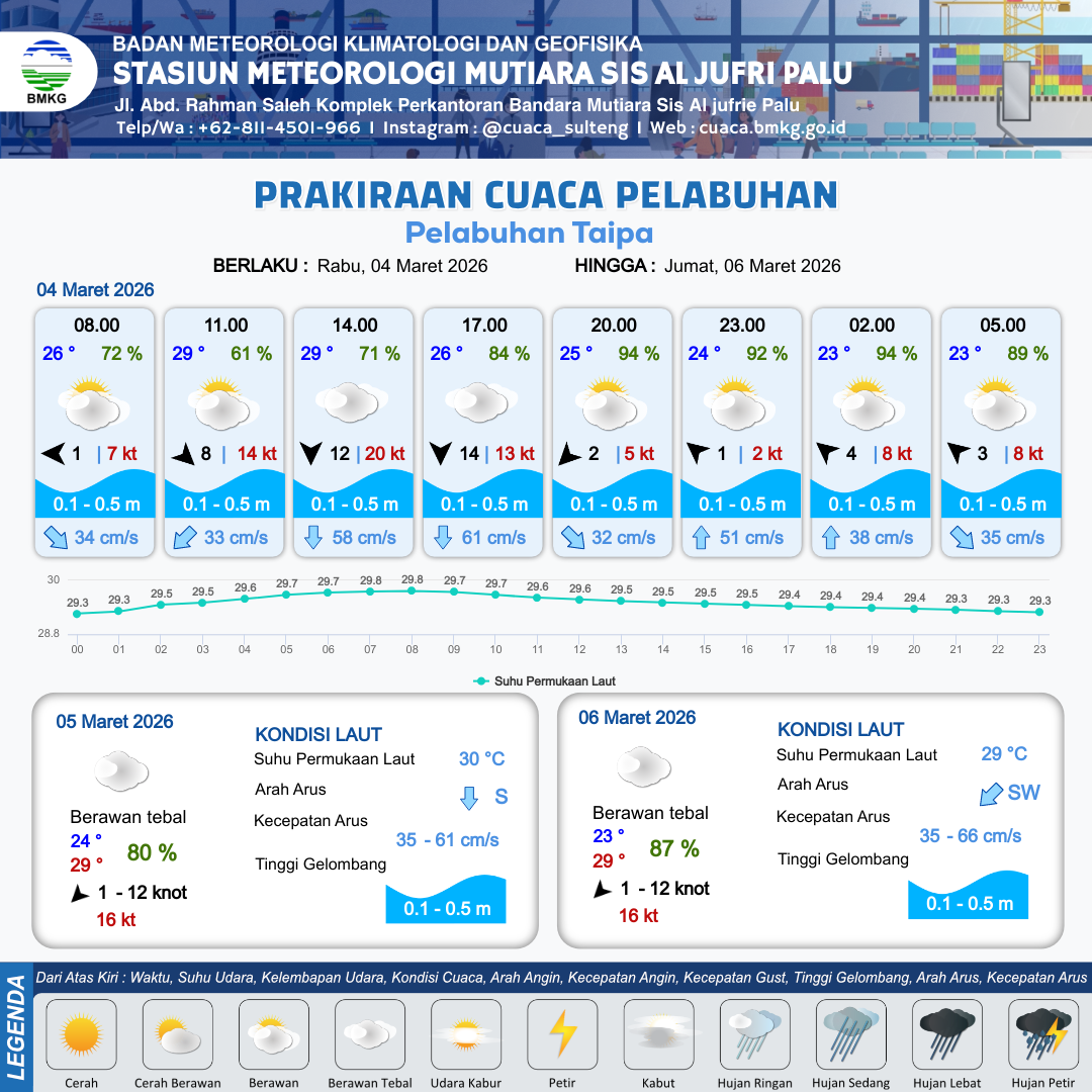 3 Mar 26, 11.00 9 jam yang lalu | Berawan Tebal | Tenggara 2 kt Gust Peningkatan kecepatan angin yang singkat dan tiba-tiba : 6 kt | | | 9 km | 24 °C | 92 % | +0.69 m |