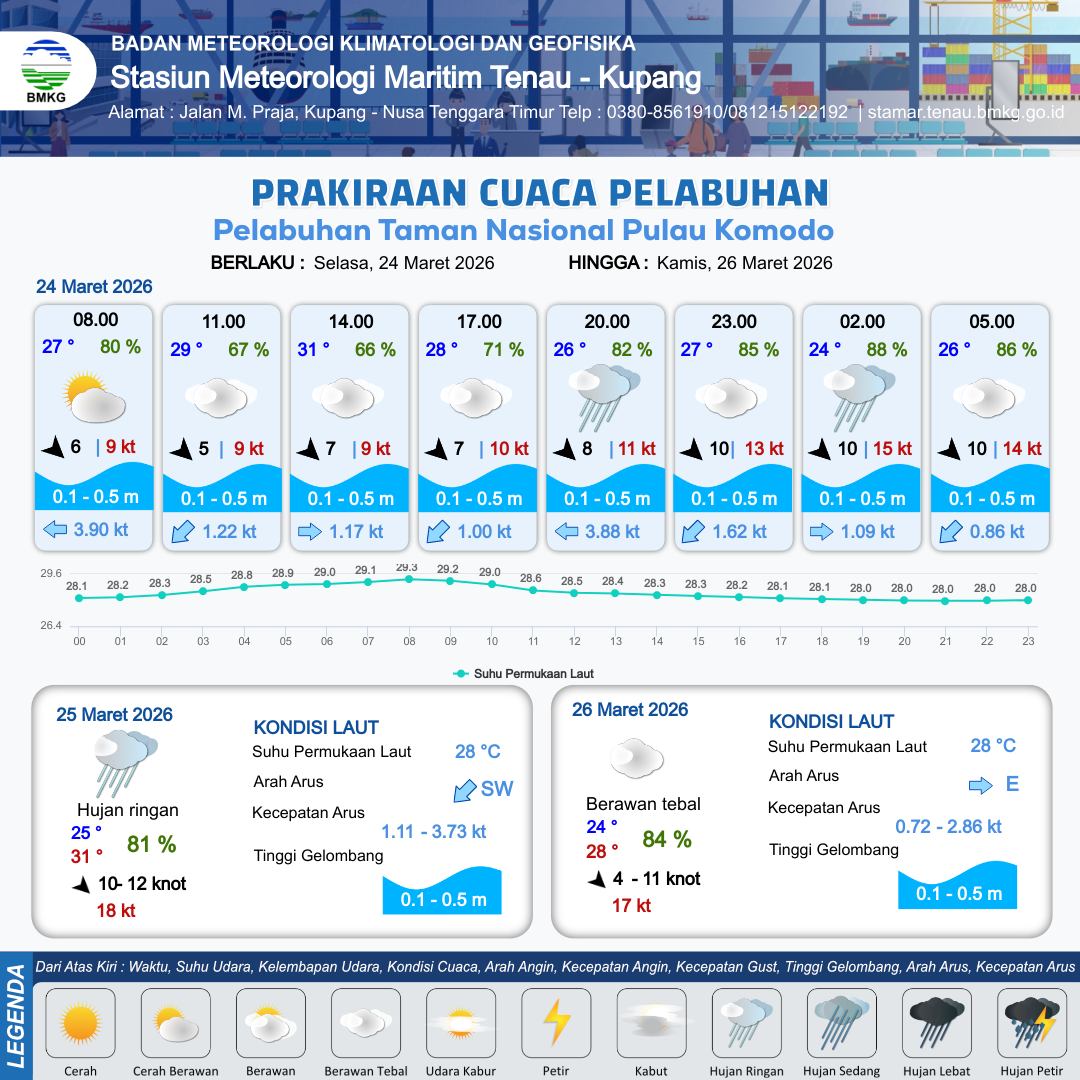 24 Mar 26, 09.00 9 jam kedepan | Barat Laut 7 kt Gust Peningkatan kecepatan angin yang singkat dan tiba-tiba : 10 kt | 0.4 m Tenang | Barat Daya 1.0 Knot | 8 km | 28 °C | 71 % | -0.06 m | |