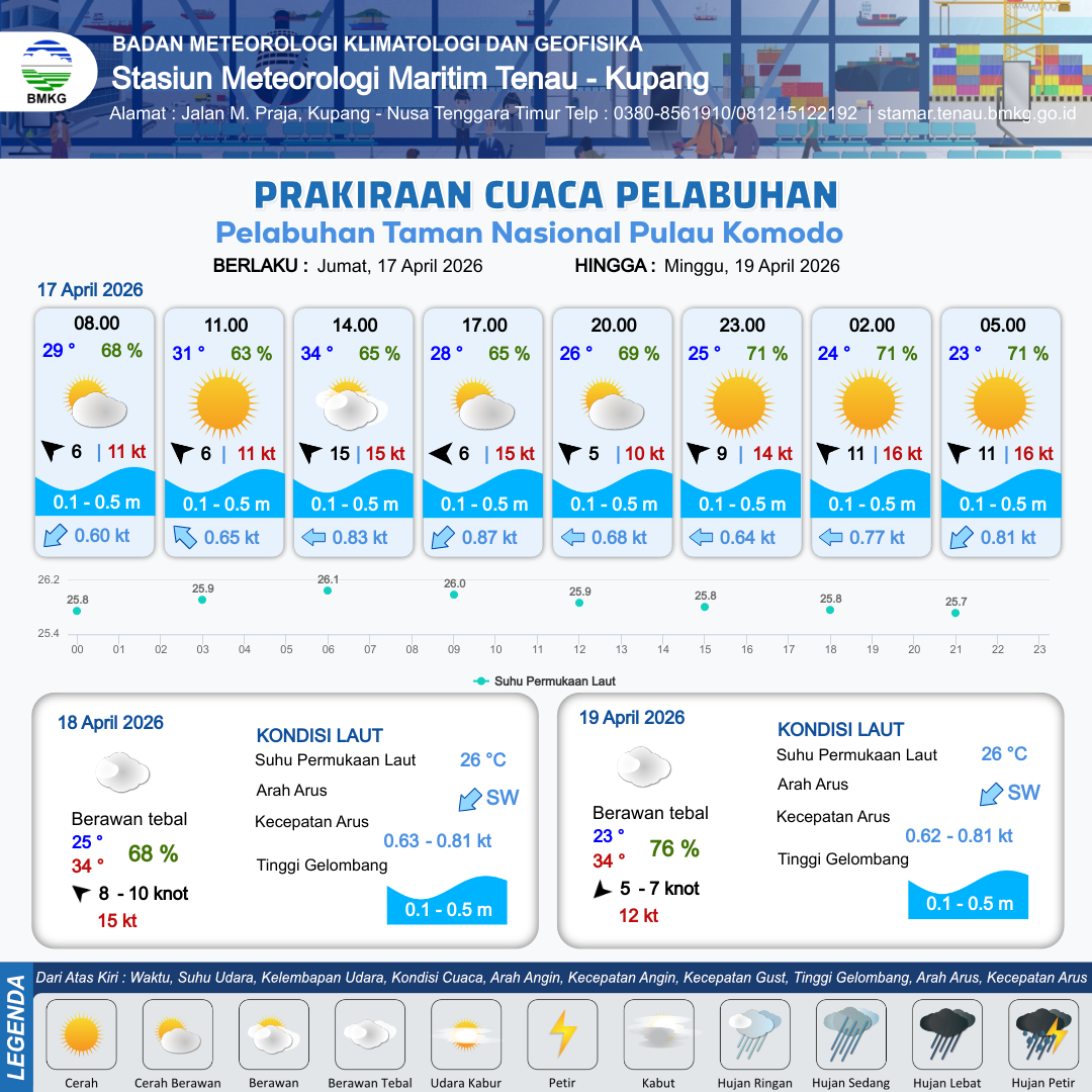 16 Apr 26, 15.00 5 jam yang lalu | Cerah Berawan | Timur 4 kt Gust Peningkatan kecepatan angin yang singkat dan tiba-tiba : 11 kt | | | 8 km | 27 °C | 75 % | +0.48 m |
