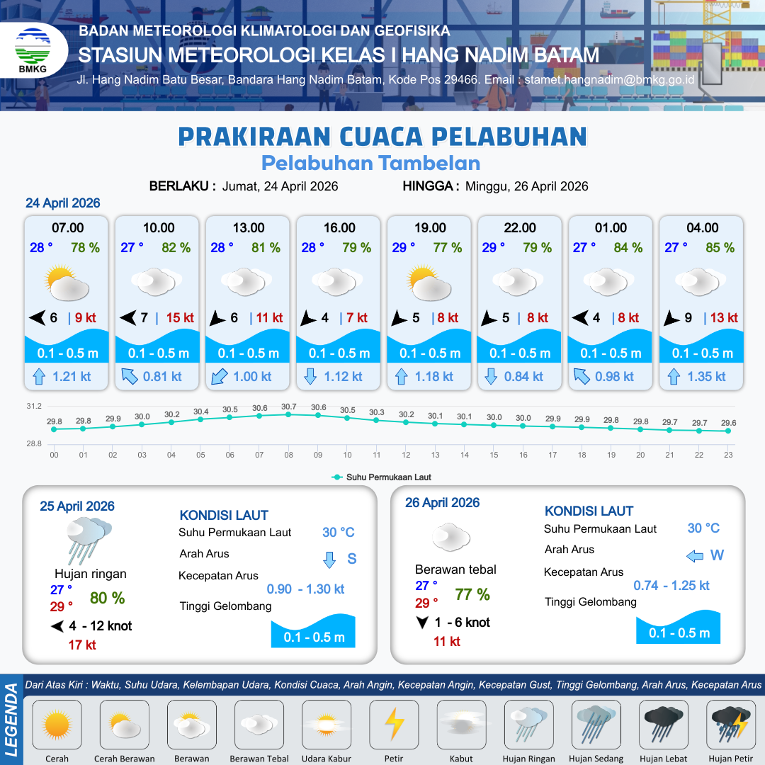 24 Apr 26, 10.00 2 jam kedepan | Timur Laut 4 kt Gust Peningkatan kecepatan angin yang singkat dan tiba-tiba : 7 kt | 0.3 m Tenang | Selatan 1.2 Knot | 10 km | 29 °C | 78 % | +0.02 m | |