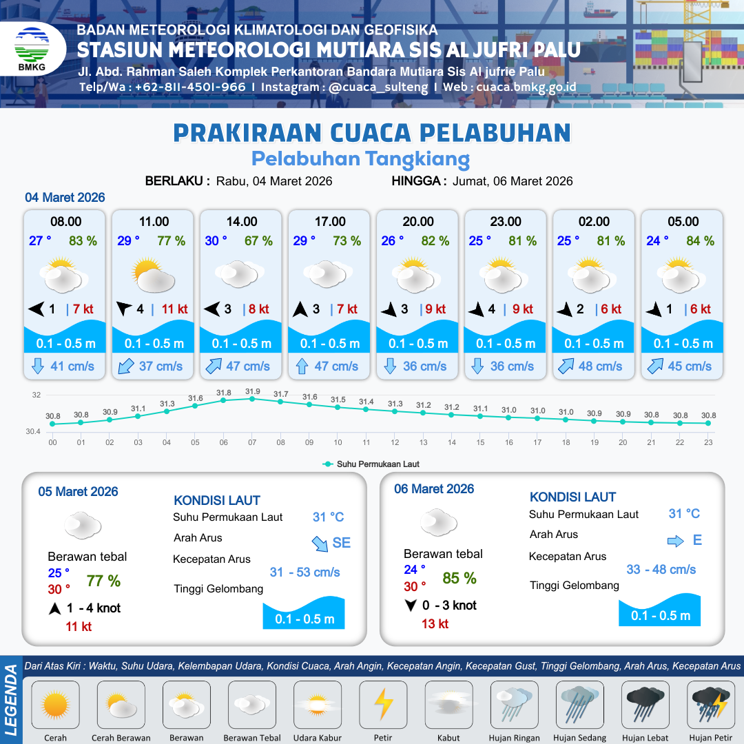 3 Mar 26, 07.00 13 jam yang lalu | Berawan | Tenggara 5 kt Gust Peningkatan kecepatan angin yang singkat dan tiba-tiba : 11 kt | | | 9 km | 30 °C | 70 % | +0.70 m |