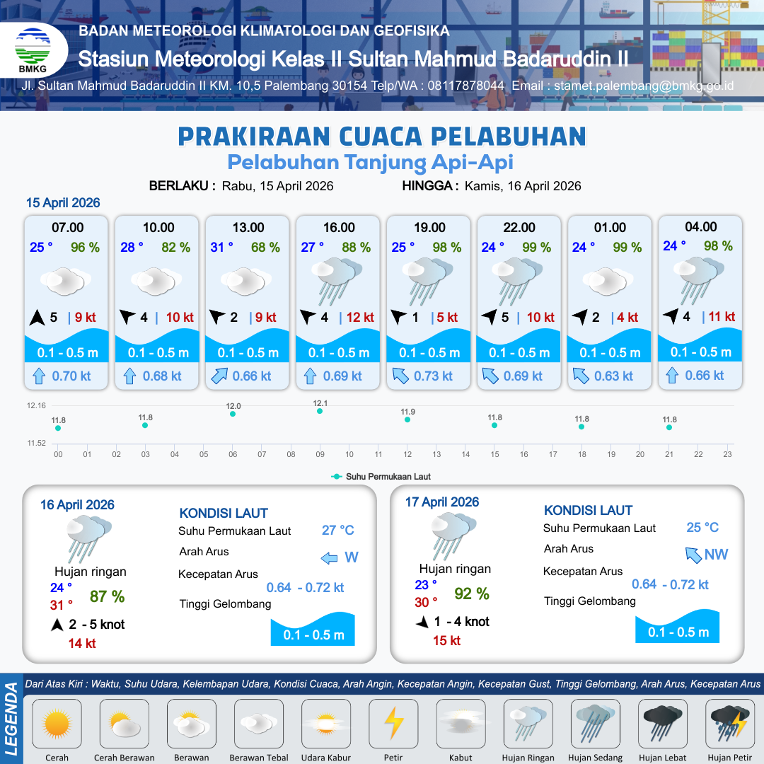 15 Apr 26, 21.00 2 jam kedepan | Hujan Ringan | Barat Daya 4 kt Gust Peningkatan kecepatan angin yang singkat dan tiba-tiba : 11 kt | | | 2 km | 24 °C | 98 % | +0.21 m |