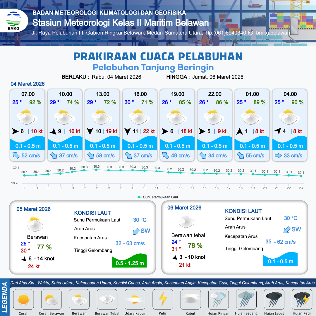 3 Mar 26, 23.00 3 jam kedepan | Berawan | Barat 4 kt Gust Peningkatan kecepatan angin yang singkat dan tiba-tiba : 7 kt | | | 10 km | 25 °C | 90 % | -0.27 m |