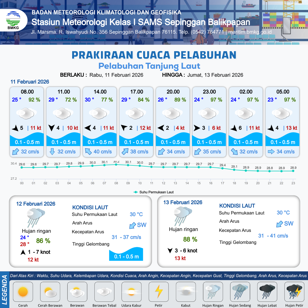 11 Feb 26, 23.00 7 jam kedepan | Barat 7 kt Gust Peningkatan kecepatan angin yang singkat dan tiba-tiba : 9 kt | 0.1 m Tenang | Timur 34.0 cm/s | 10 km | °C | 96 % | +0.06 m |