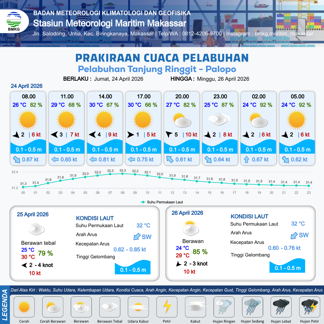 24 Apr 26, 08.00 Saat ini | Barat 1 kt Gust Peningkatan kecepatan angin yang singkat dan tiba-tiba : 6 kt | 0.1 m Tenang | Barat 0.8 Knot | 10 km | 30 °C | 64 % | +0.50 m | |