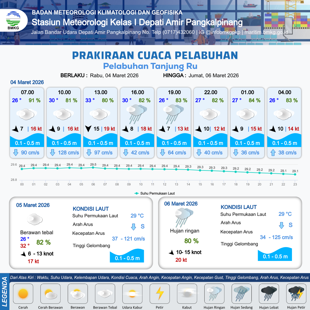 3 Mar 26, 23.00 3 jam kedepan | Berawan Tebal | Barat Laut 7 kt Gust Peningkatan kecepatan angin yang singkat dan tiba-tiba : 19 kt | | | 10 km | 25 °C | 93 % | +0.80 m |