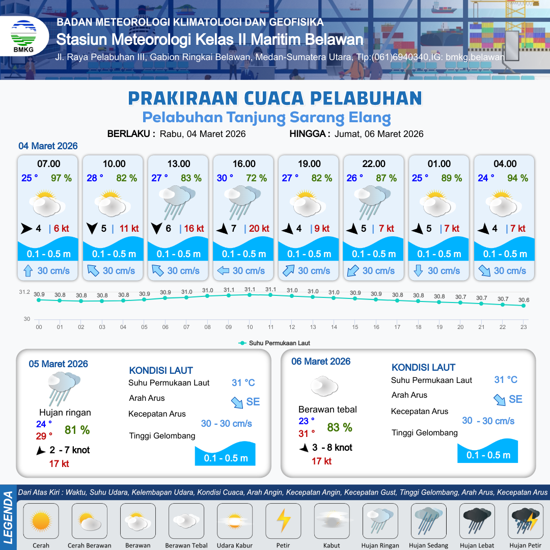3 Mar 26, 08.00 12 jam yang lalu | Berawan | Barat Laut 6 kt Gust Peningkatan kecepatan angin yang singkat dan tiba-tiba : 15 kt | | | 10 km | 30 °C | 73 % | -0.07 m |