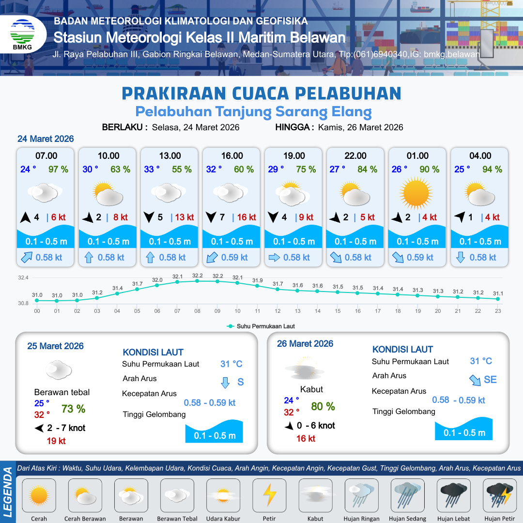 24 Mar 26, 09.00 9 jam kedepan | Utara 7 kt Gust Peningkatan kecepatan angin yang singkat dan tiba-tiba : 16 kt | 0.1 m Tenang | Barat Daya 0.6 Knot | 10 km | 32 °C | 60 % | -0.07 m | |