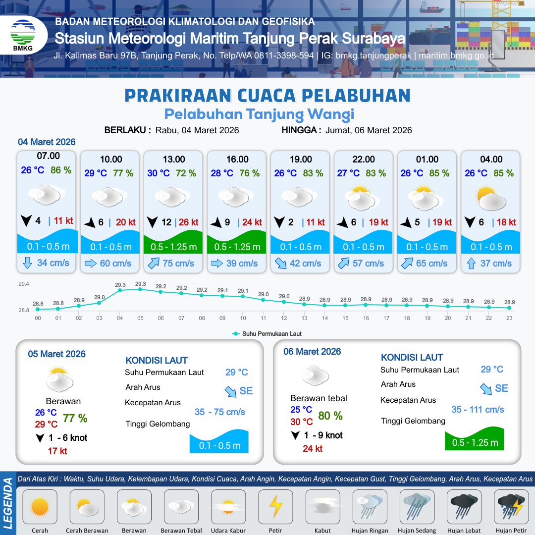 3 Mar 26, 23.00 3 jam kedepan | Berawan Tebal | Timur Laut 4 kt Gust Peningkatan kecepatan angin yang singkat dan tiba-tiba : 12 kt | | | 10 km | 26 °C | 81 % | -0.85 m |