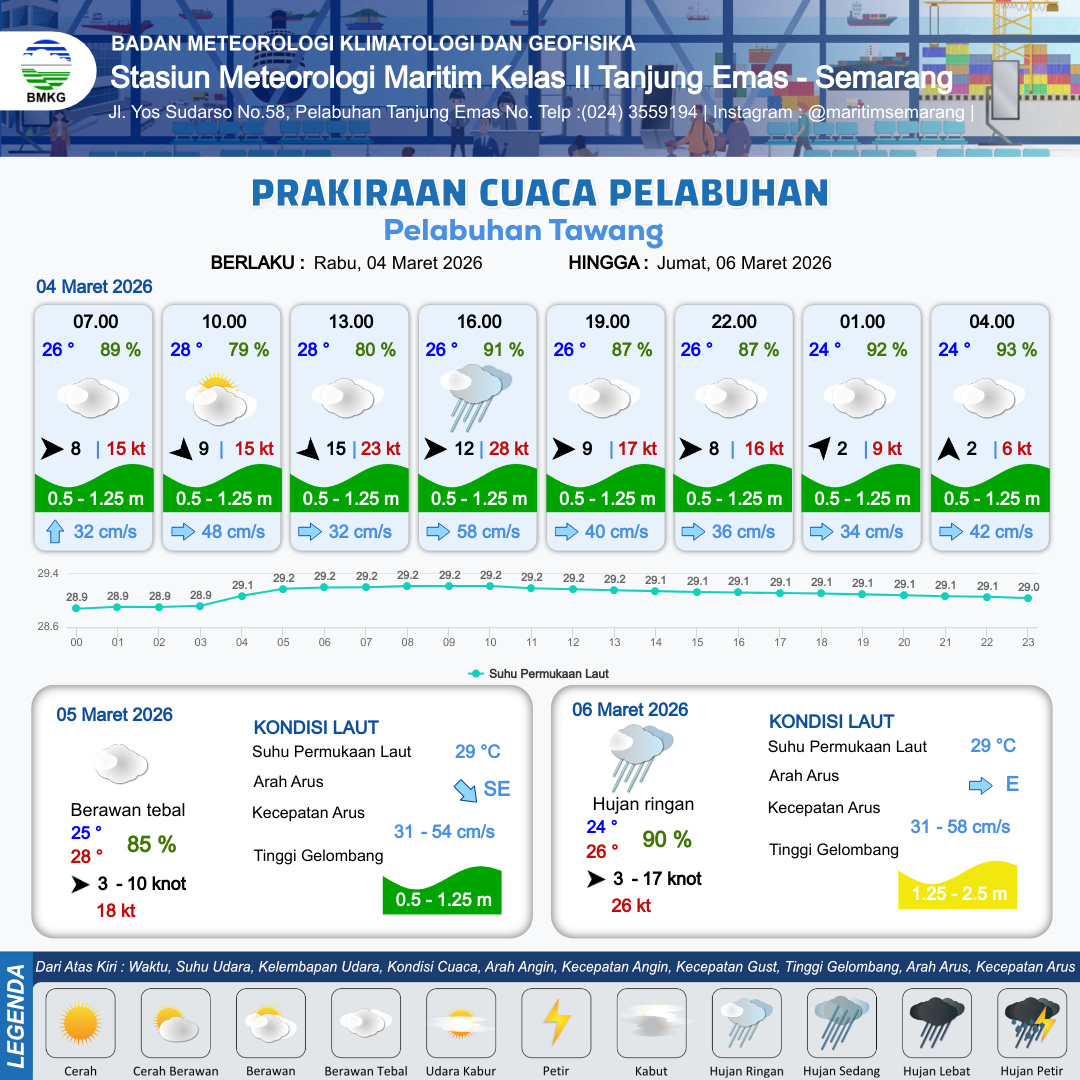 3 Mar 26, 05.00 15 jam yang lalu | Berawan Tebal | Barat 13 kt Gust Peningkatan kecepatan angin yang singkat dan tiba-tiba : 26 kt | | | 8 km | 28 °C | 78 % | -0.09 m |