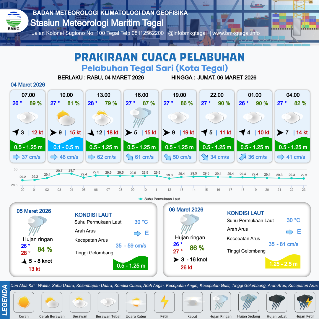 3 Mar 26, 04.00 16 jam yang lalu | Berawan | Barat Laut 13 kt Gust Peningkatan kecepatan angin yang singkat dan tiba-tiba : 21 kt | | | 10 km | 30 °C | 79 % | +0.24 m |