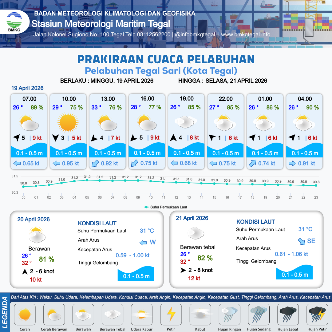 19 Apr 26, 22.00 21 jam kedepan | Barat Daya 1 kt Gust Peningkatan kecepatan angin yang singkat dan tiba-tiba : 7 kt | 0.3 m Tenang | Timur 0.8 Knot | 7 km | 26 °C | 88 % | -0.48 m | |