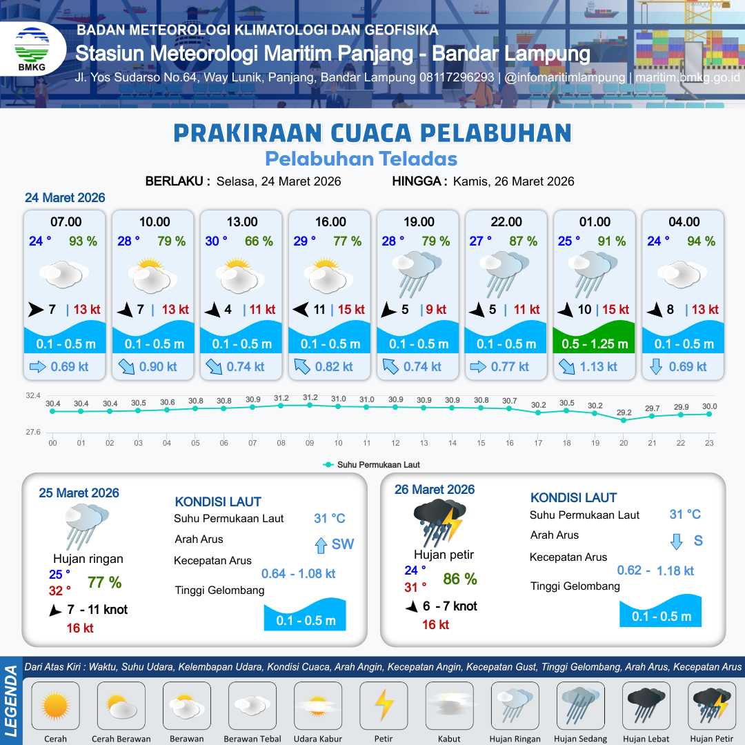 24 Mar 26, 03.00 3 jam kedepan | Barat Laut 7 kt Gust Peningkatan kecepatan angin yang singkat dan tiba-tiba : 13 kt | 0.7 m Rendah | Selatan 1.2 Knot | 10 km | 28 °C | 79 % | -0.17 m | |