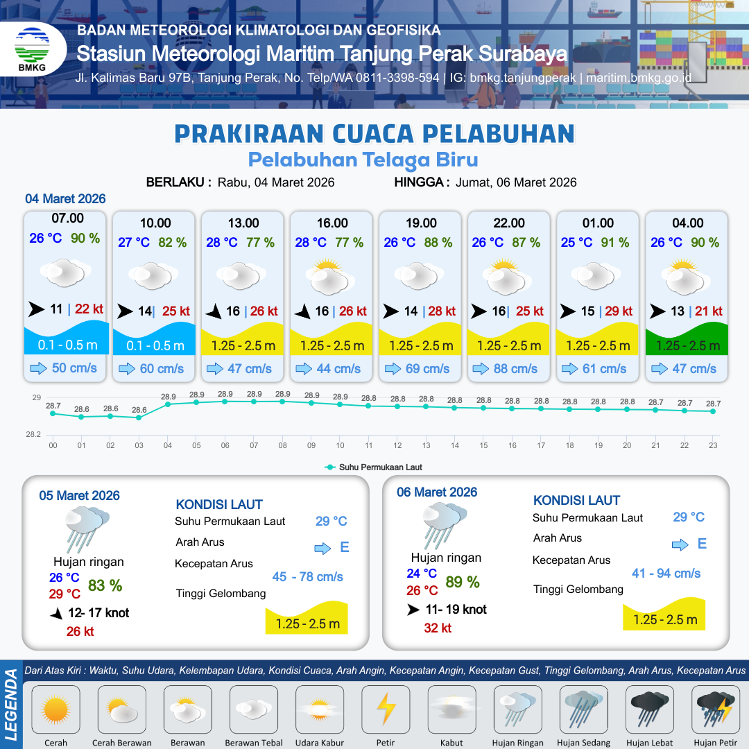 3 Mar 26, 08.00 12 jam yang lalu | Berawan Tebal | Barat 13 kt Gust Peningkatan kecepatan angin yang singkat dan tiba-tiba : 26 kt | | | 10 km | 29 °C | 79 % | +0.45 m |