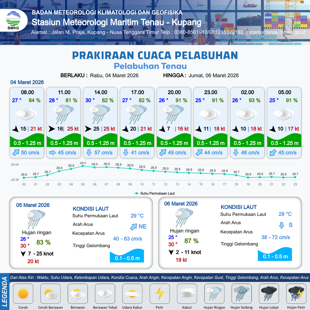 3 Mar 26, 15.00 5 jam yang lalu | Berawan Tebal | Barat 13 kt Gust Peningkatan kecepatan angin yang singkat dan tiba-tiba : 19 kt | | | 10 km | 25 °C | 89 % | +1.37 m |