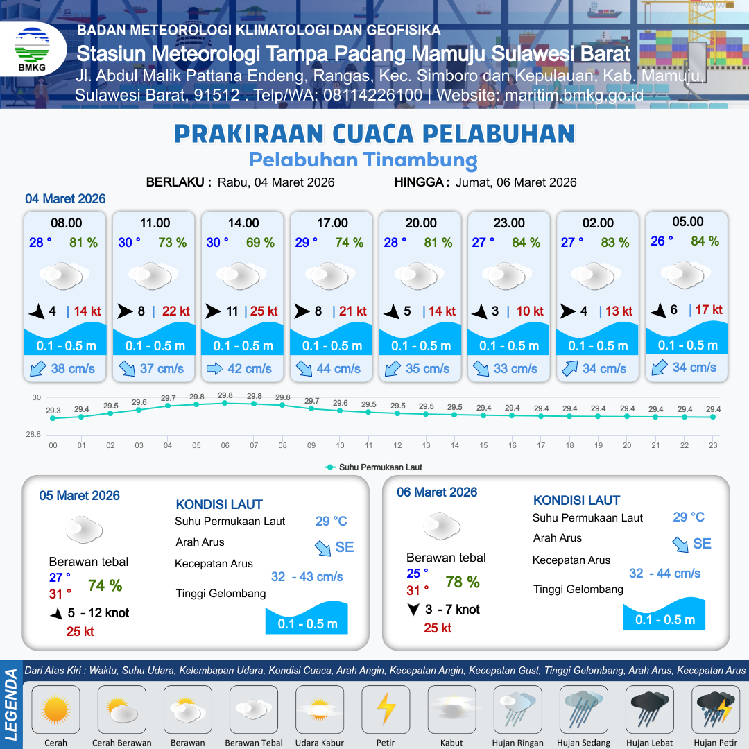 3 Mar 26, 10.00 10 jam yang lalu | Berawan | Barat 7 kt Gust Peningkatan kecepatan angin yang singkat dan tiba-tiba : 15 kt | | | 9 km | 29 °C | 75 % | +0.31 m |